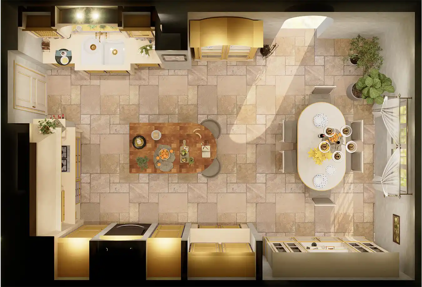 Durable materials High-quality materials, such as solid French white oak cabinets, quartz countertops, traditional plaster structure, cobble stone floor put together with stainless steel appliances, ensure that the kitchen will last for many years.